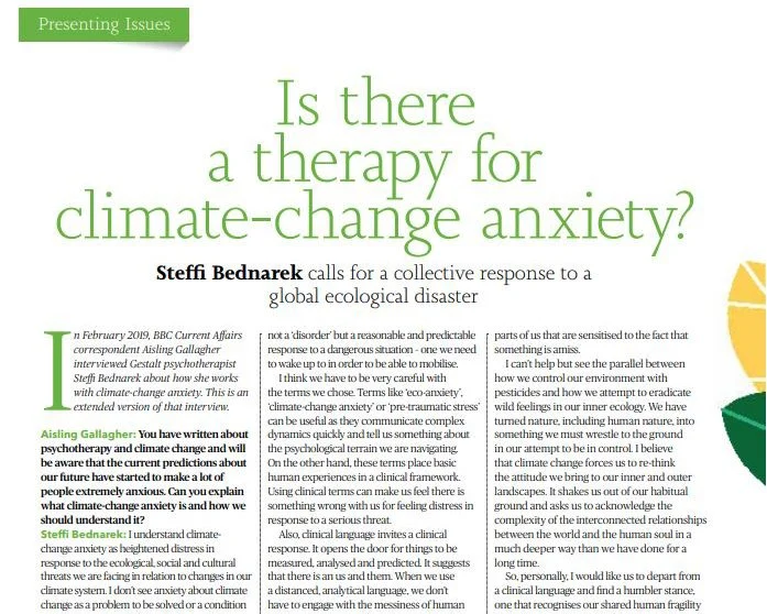 In this interview in Therapy Today with BBC journalist Aishling Gallagher, Steffi speaks about eco-anxiety and the challenge this very human response poses to the mental health profession.